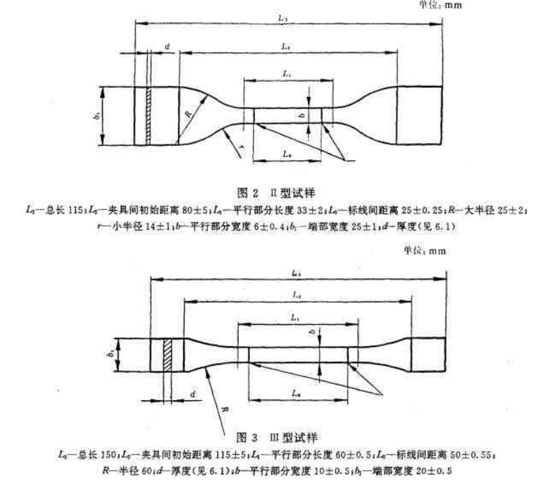 本方法規(guī)定使用四種類型的試樣,I、II、 II型為啞鈴形試樣。見圖1~圖3。IV型為長條型試樣,寬度10~25 mm,總長度不小于150 mm,標(biāo)距至少為50 mm。