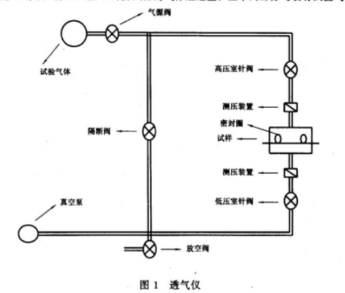 塑料薄膜或薄片將低壓室和高壓室分開,高壓室充有約10’Pa的試驗(yàn)氣體,低壓室的體積已知。試樣密封后用真空泵將低壓室內(nèi)空氣抽到接近零值。