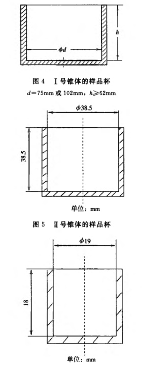 (3>樣品杯﹑為平底圓筒,不同型號的錐體配套使用不同型號的樣品杯(圖4~圖6)。Ⅰ~Ⅲ號錐體配套使用的樣品杯的形狀尺寸如圖4~圖6所示。